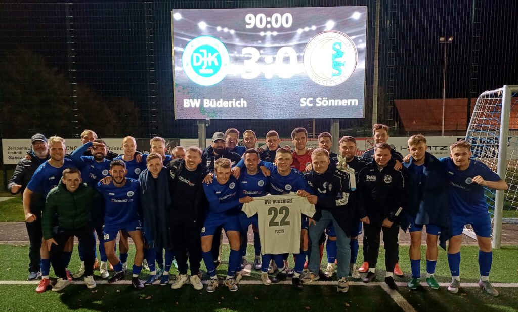 Rechnerisch war es ein erfolgreicher Abend für Blau-Weiß. Im Spitzenderby gegen unsere Freunde aus Sönnern konnten drei Punkte beim 3:0-Sieg eingefahren werden. Nach einem so klaren Ergebnis sah es allerdings lange Zeit nicht aus. Insbesondere vor der Halbzeitpause fand der SC Sönnern immer wieder den Weg vor das Büdericher Tor, verpasste es jedoch, sich zu belohnen. Erleichterung aus Büdericher Sicht dann in der 53. Minute durch das 1:0 von Andi Fuchs, der nur wenige Minuten später zur tragischen Figur des Abends avancierte: eine Schulterverletzung erwies sich als so gravierend, dass das Spiel für 20 Minuten unterbrochen werden musste, um ihn durch die herbeigerufenen Rettungssanitäter versorgen und ins Krankenhaus fahren zu lassen. Mittlerweile ist Fuchs mit eingerenkter Schulter wieder aus dem Krankenhaus entlassen, die Nachuntersuchungen werden hoffentlich keine weiteren Schäden ergeben.